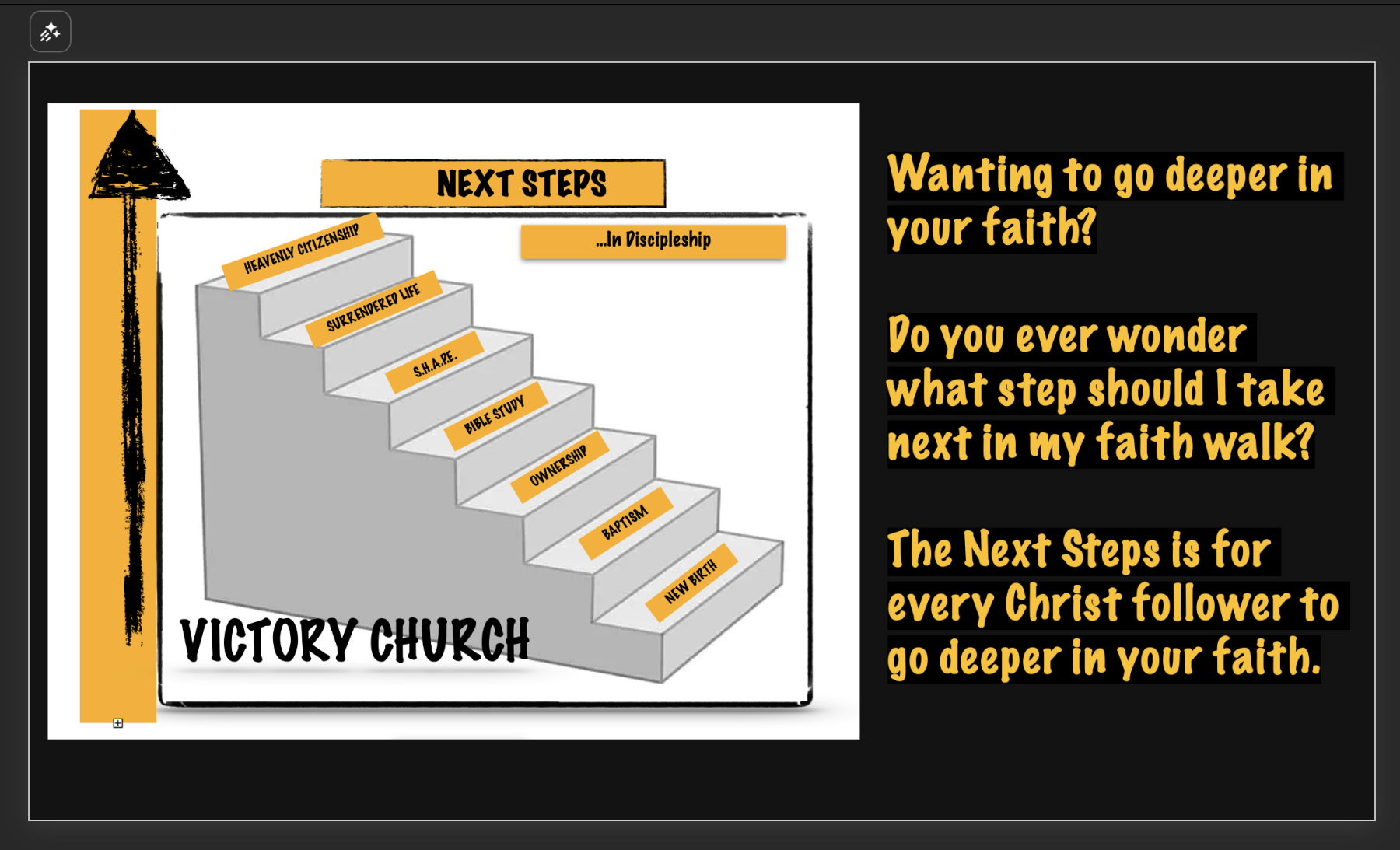 At Victory we want everyone to experience victory in their faith walk by drawing closer to the Lord and Savior Jesus Christ. So at Victory we offer a path that is clear in spiritual growth but that doesn't mean it is simple or without the guidance of God's Word or the Holy Spirit. What it does include in Biblical principles of spiritual growth in a way that makes sense and draw one into their relationship with Jesus on His terms. God doesn't make us with cookie cutters so our experiences differ from one another but Jesus did say we must obey Him to be a true follower.